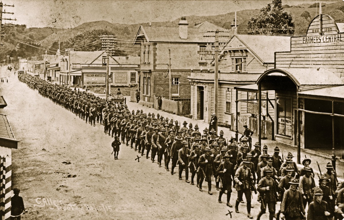Troops On Main Street, 1915. Bystanders watch as troops march through Upper Hutt on their way to Trentham Camp. Note the glimpse of a barber shop, with its tell-tale painted pole, at left, and the horse and cart in front of the Post Office at centre.